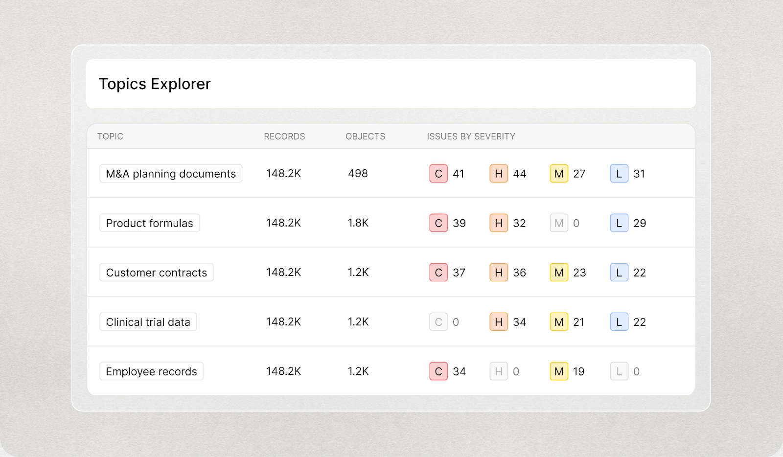 Topics makes classification operational by turning scattered findings into a decision-ready view of risk. Teams can prioritize exposure by business concept, see where that concept concentrates, understand why it is exposed, and remediate the highest-consequence areas first, with traceability back to the underlying signals.