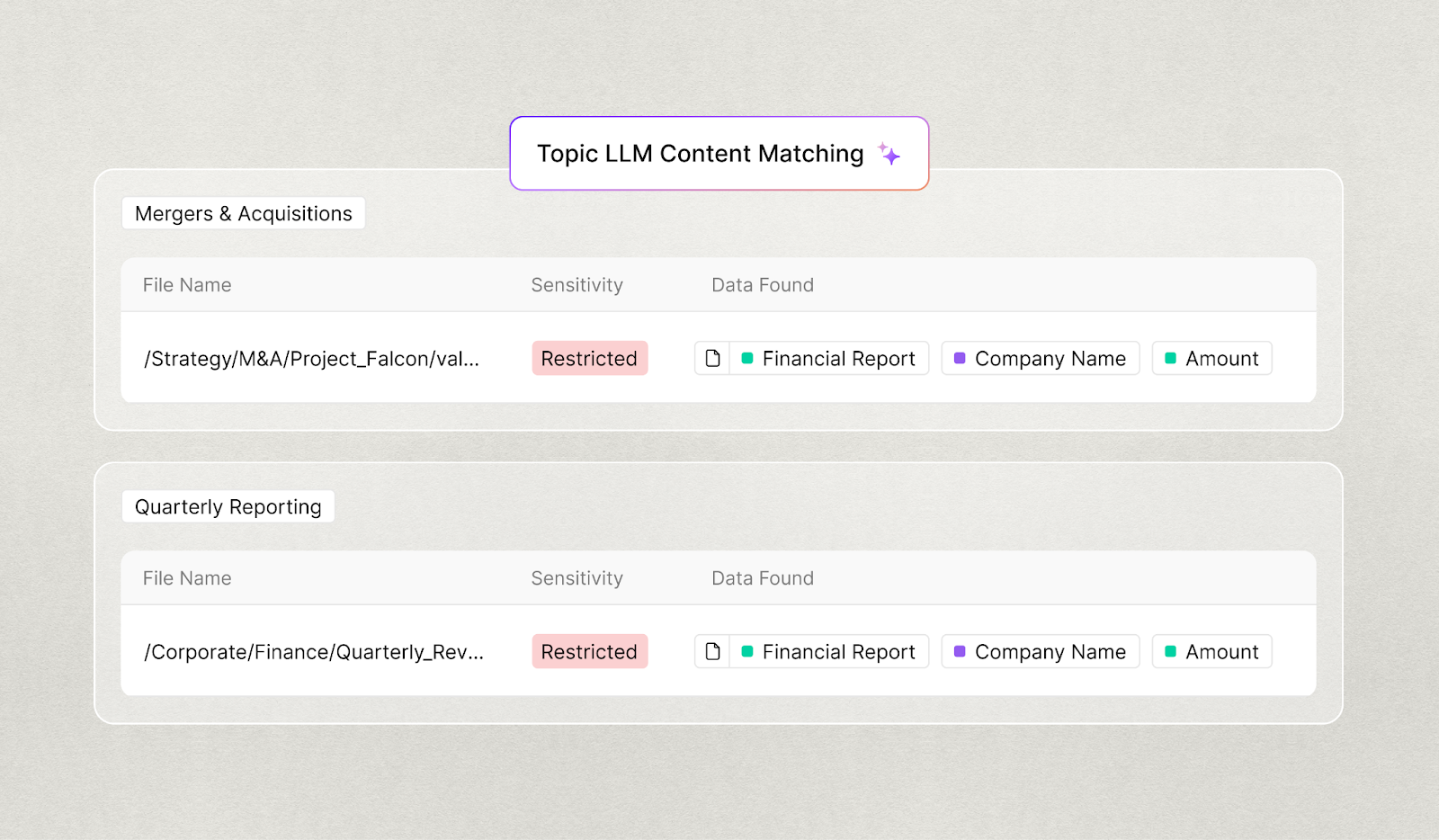 The result is a smaller set of meaningful concepts, such as M&A planning documents, product formulas, customer contracts, clinical trial data, or financial planning and forecasting, that security teams can prioritize, govern, and remediate.