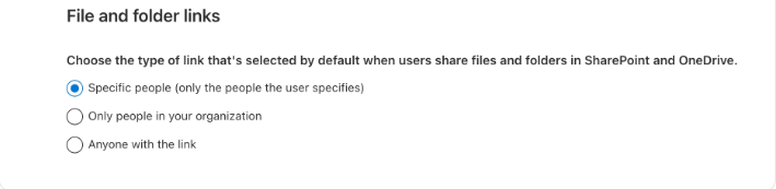 Change the default to "Specific people." This ensures sharing links are scoped only to explicitly named recipients. The PowerShell command is one line: